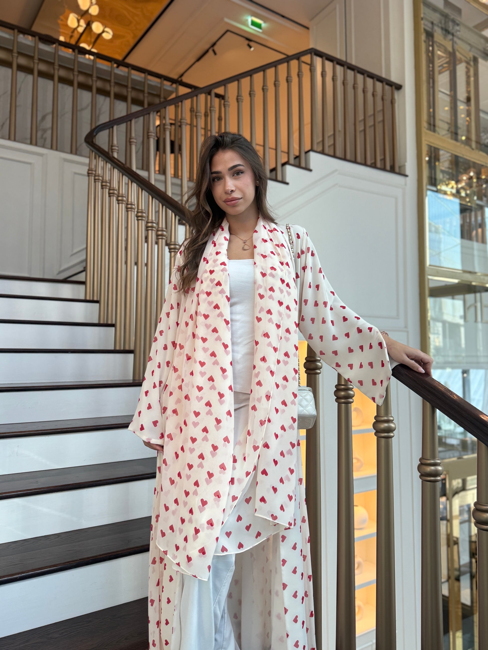 - This printed off- white abaya with red heart print is crafted from soft, flowy chiffon georgette. Comes as a set with a matching printed hijab. Can be customised with buttons for added detail.