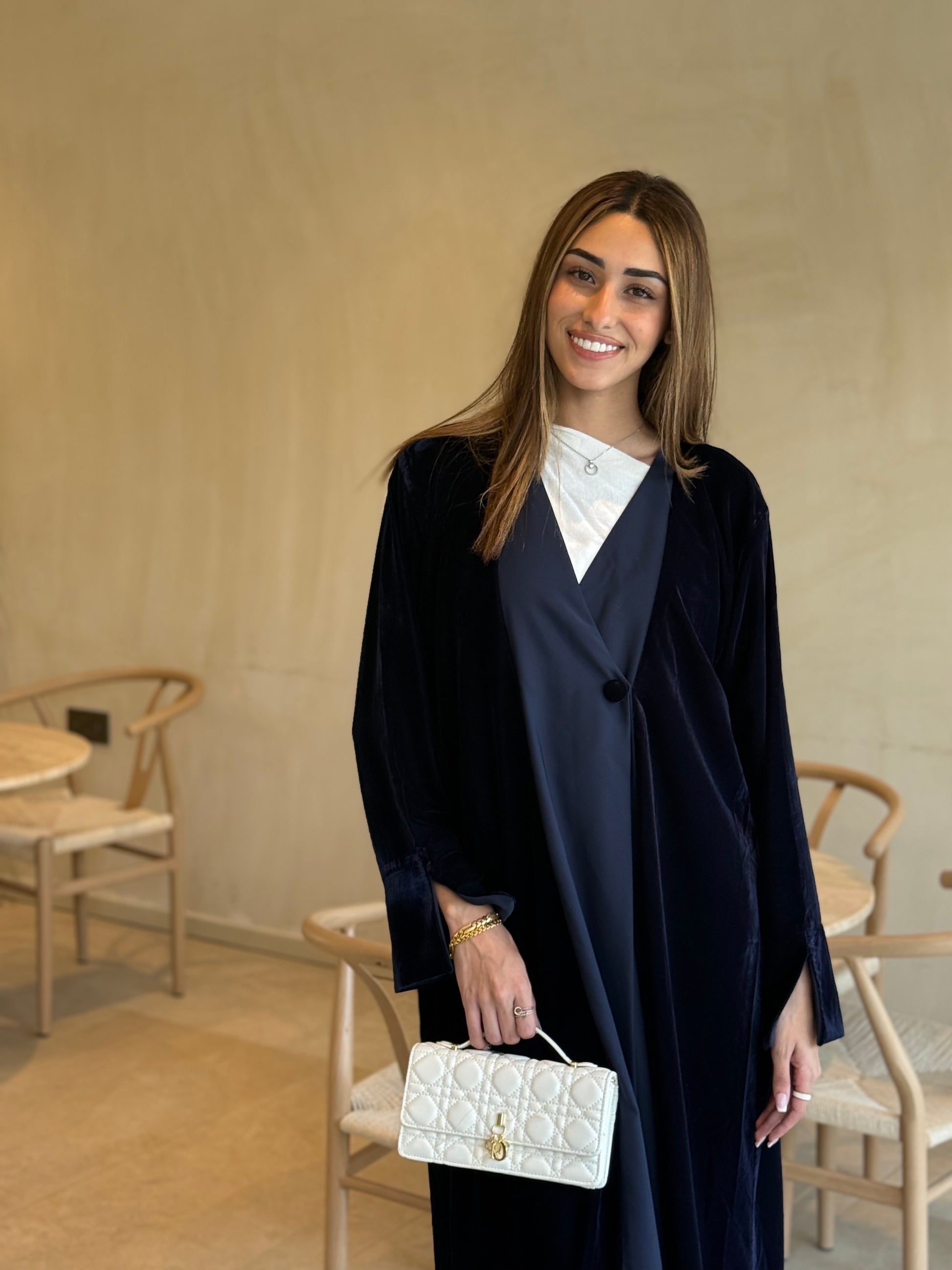 I wore this abaya during a trip to Chicago, and it was amazing for the colder evenings. The velvet feels warm, soft, and super luxurious. The navy color looks incredibly rich and elegant in person.